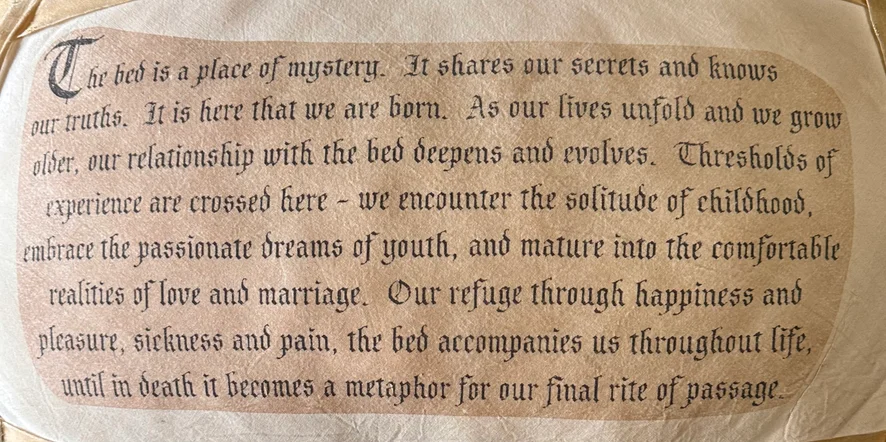 "The bed is a place of mystery. It shares our secrets and knows our truths. It is here that we are born. As our lives unfold and we grow older, our relationship with the bed deepens and evolves. Thresholds of experience are crossed here - we encounter the solitude of ch-ldhood, embraces the passionate dreams of youth, and mature into the comfortable realities of love and marriage. Our refuge through happiness and pleasure, sickness and pain, the bed accompanies us throughout life, until in d-th it becomes a metaphor for our final rite of passage."